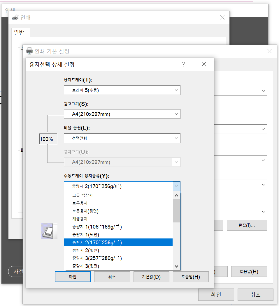위와 같이 용지선택상세설정 메뉴를 클릭해야 한다.